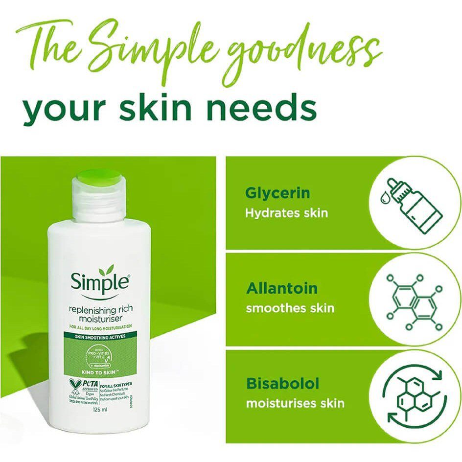 سیمپل (Simple) یک برند انگلیسی است که به‌خاطر محصولات ساده، ملایم و بدون مواد حساسیت‌زا شناخته می‌شود. شعار این برند “Skin Loving, Kind to Skin” است، به این معنا که تمام محصولاتش طوری طراحی شده‌اند که حتی برای حساس‌ترین پوست‌ها نیز قابل استفاده باشند. سیمپل در محصولات خود از مواد مضر مانند پارابن، عطرهای مصنوعی، رنگ‌های شیمیایی و الکل استفاده نمی‌کند. آبرسان ریچ سیمپل نیز بر همین اساس فرمولاسیون شده و به یک انتخاب مطمئن برای مراقبت روزانه پوست تبدیل شده است.